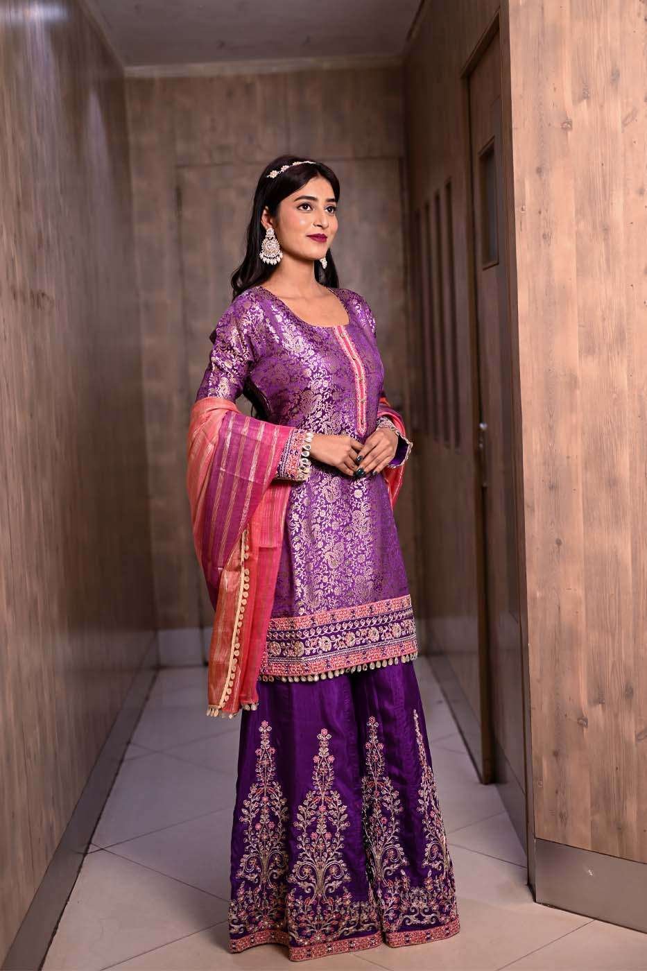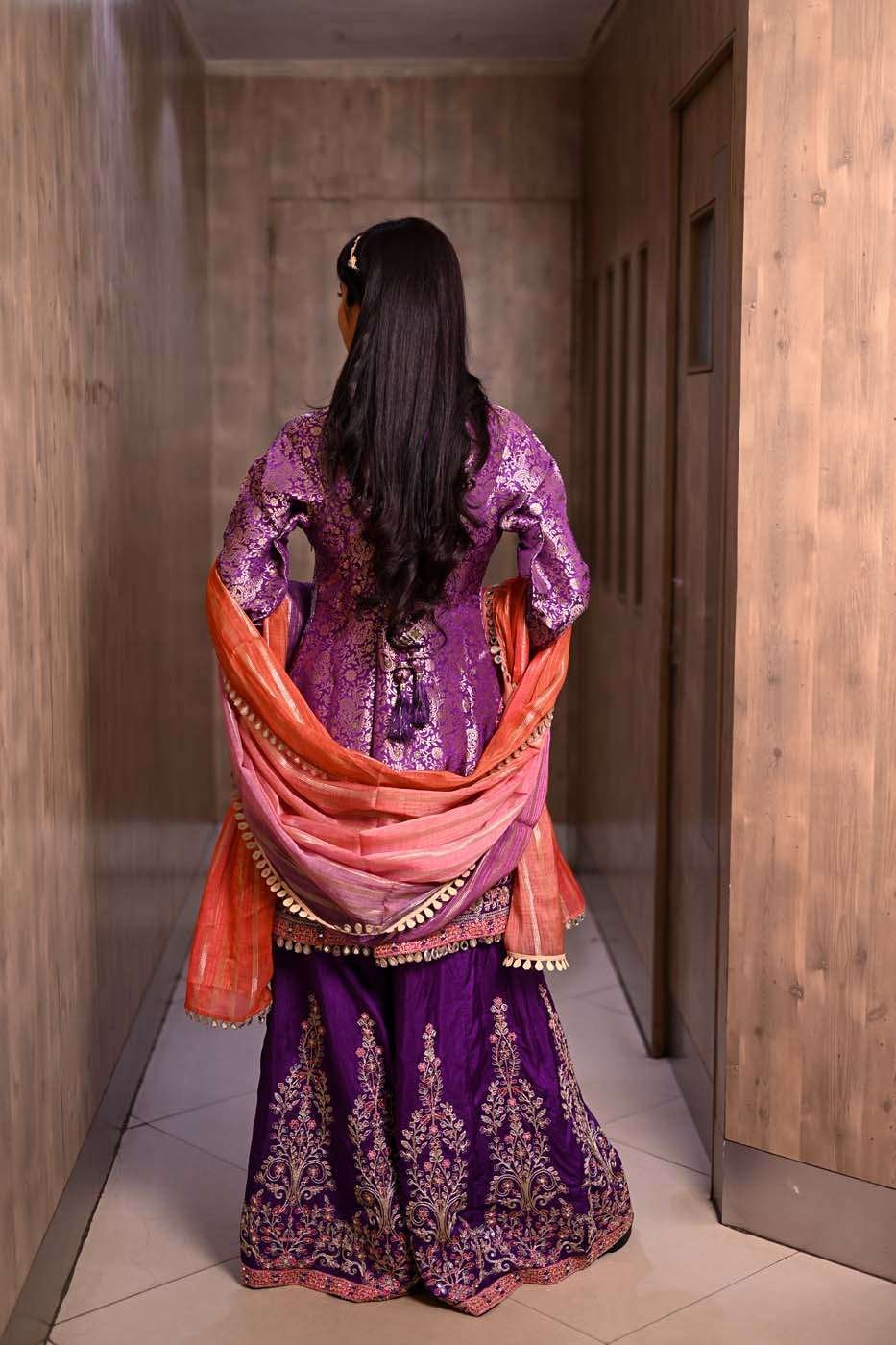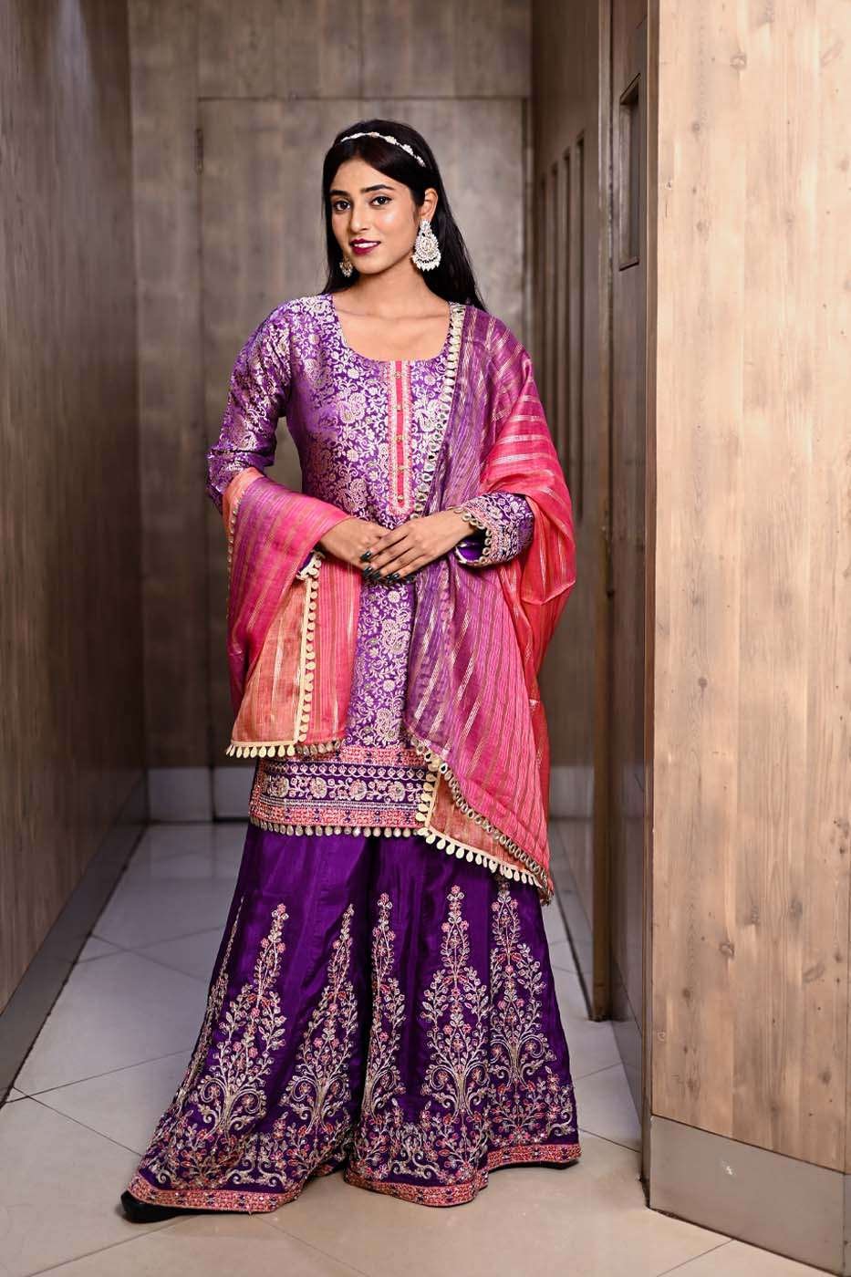 This royal purple sharara set, made from premium Banarasi silk brocade, exudes elegance and charm. The kurta is beautifully embellished with gold zari embroidery and delicate sequins and mirror embellishments, paired with a voluminous sharara featuring intricate floral motifs. The vibrant ombre dupatta, highlighted with a mirror lace border, completes this majestic look.